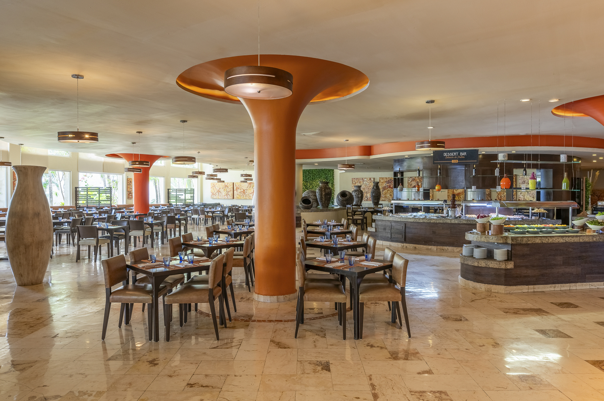 Catering As catering services the hotel offers all-inclusive and self-catering. Breakfast is offered from the buffet, à la carte or as brunch. Lunch and dinner are also served as a set meal, à la carte or from the buffet with starters, salads and desserts. Half board includes lunch. When booking half board plus, dinner and beverages during meals (limited) are included. When booking all-inclusive, one welcome drink and one meal in the à la carte restaurant are included. For the meals, there are a buffet restaurant (Italian, Mediterranean, calorie-reduced, gluten-free and vegetarian dishes) and several bars, the cafeteria, a 24h snackbar, the pool bar as well as a sky bar. The drinks menu of the hotel includes water, soft drinks, coffee and tea, beer and wine. You can take part in the cooking classes offered by the hotel during your stay.