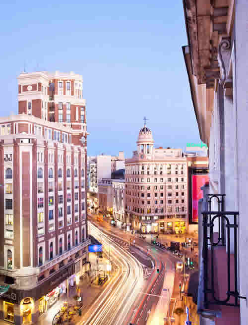 El hotel Rex se ubica en plena Gran Vía, entre la Plaza de España y la Plaza de Callao, en un edificio de 1945 rehabilitado en 2004 con un total de 145 habitaciones, la mayoría con vistas a la Gran Vía.